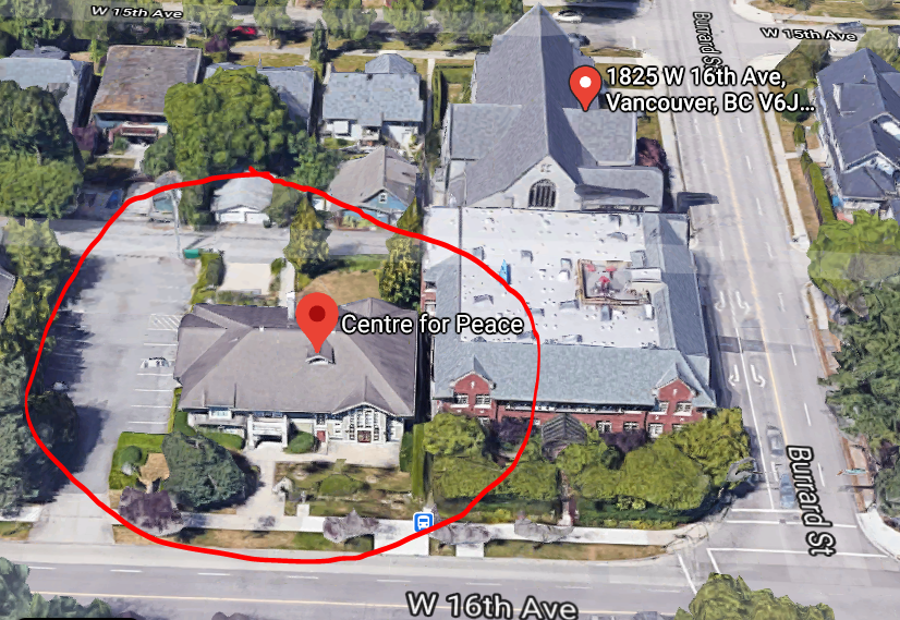The Memorial Service will take place at the Centre for Peace (circled in red on the map). Do not go to the church. Parking for the Centre for Peace is located on W 16th Ave between Burrard St and Cypress St. You can also access the parking lot via the laneways. After parking, please enter through the side entrance of the Centre for Peace (where the grassy area is).